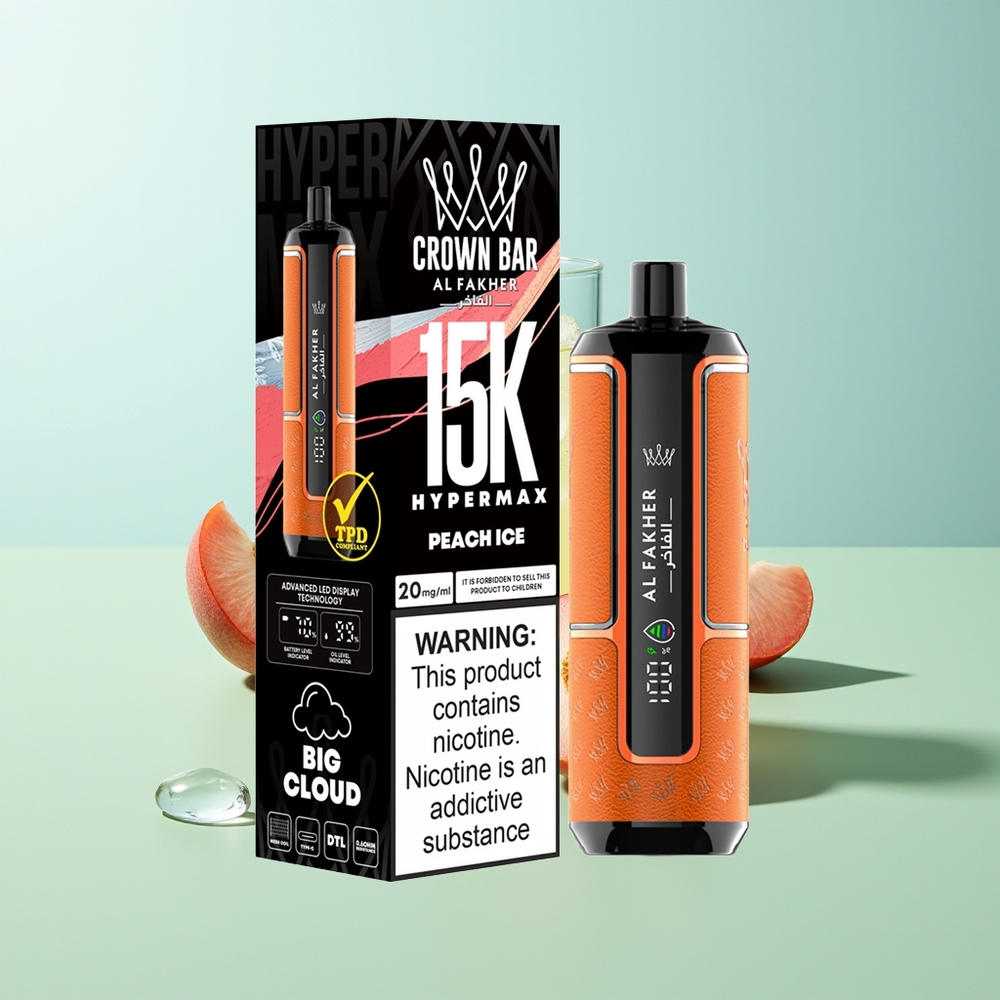 החוויה האולטימטיבית של עישון אלקטרוני מגיעה עם Al Fakher Crown Bar 15K Hypermax אידוי חד פעמי Kit. מוצר חדשני ומתקדם שמשלב עיצוב קומפקטי עם ביצועים עוצמתיים. מתאים לחובבי ה-DTL ומציע עד 15,000 מקטרות באיכות גבוהה.